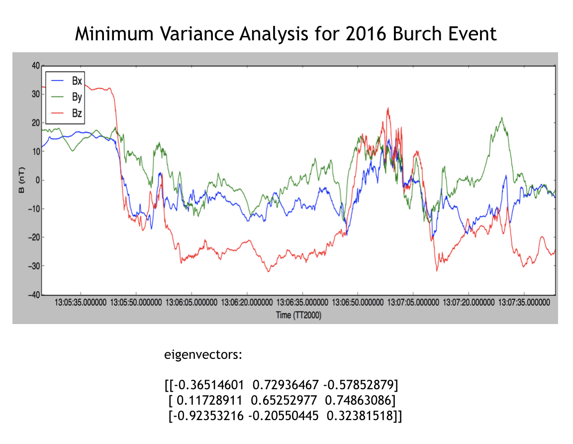 During an 8-month research assistantship at Princeton Plasma Physics Laboratory under Dr. Masaaki Yamada, I implemented a minimum variance analysis (MVA) technique to detect magnetic reconnection events in space. This work calibrated magnetic recordings from the four spacecraft launched by NASA's Magnetospheric Multiscale Mission. From the data I identified ~30 candidates as likely reconnection events, which were further analyzed by the lab. Understanding reconnection is a key part of developing nuclear fusion energy here on earth.