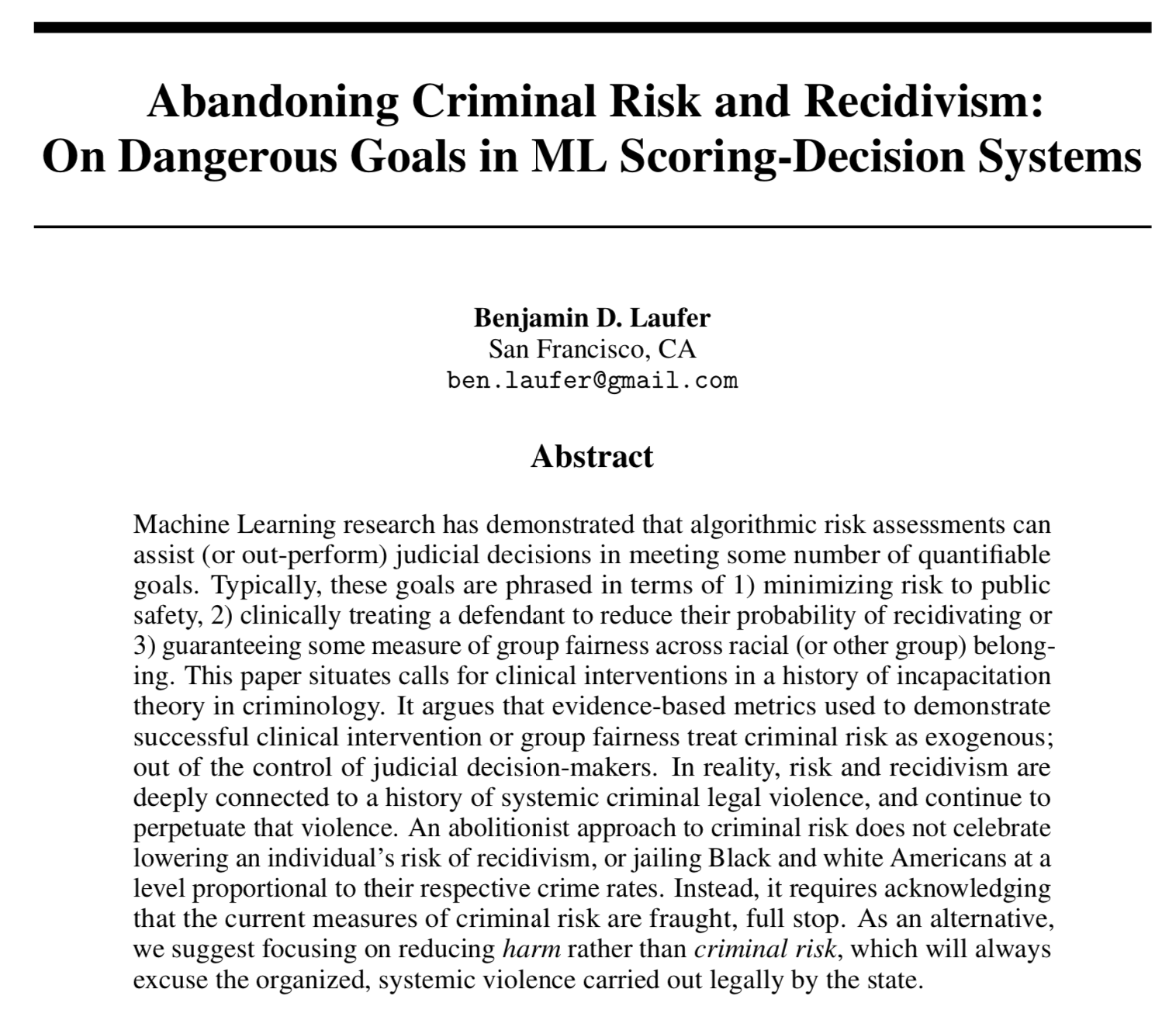 Ben Laufer is a PhD candidate in the Bowers School of Computing and Information Science at Cornell Tech. He is advised by Jon Kleinberg and Helen Nissenbaum and affiliated with the AI, Policy, and Practice Group and the Digital Life Initiative (DLI). His research studies how data-driven and AI technologies behave, how they interact with people and institutions, and how they should be governed. He draws on tools from network science, game theory, statistics, and ethics, law, and policy to build models and measurements for understanding the social impacts of computing. Before Cornell, he worked as a data scientist at Lime, and he earned his B.S.E. in Operations Research and Financial Engineering from Princeton University.