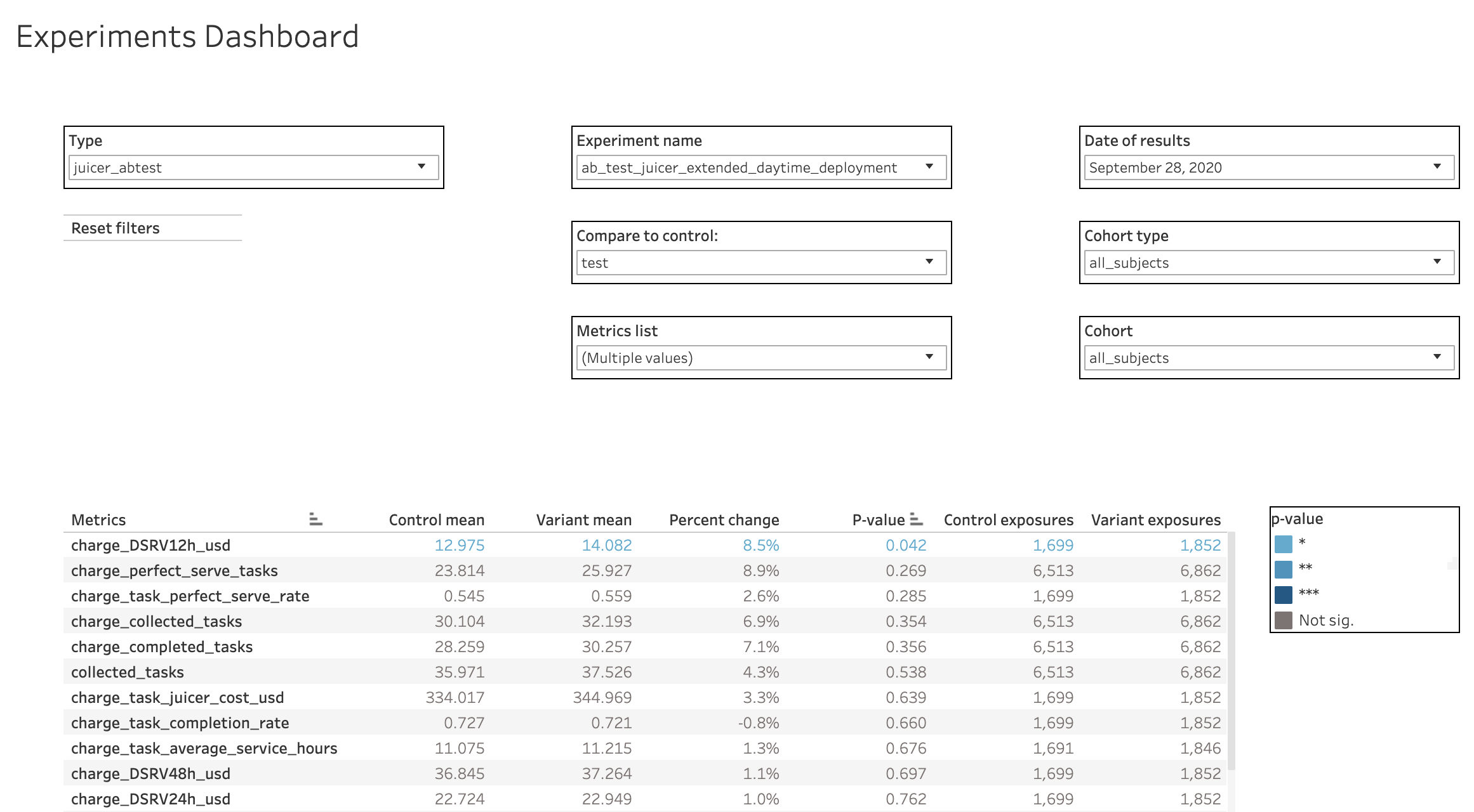 Supporting randomized A/B tests is fun but the work gets repetitve. I created an automated tool that performs relevant statistical hypothesis tests and reports treatment effects for a number of metrics. The tool supports randomized A/B tests on the vehicle, user, juicer, and switchback (region-day) levels. This was a "10x" project - it enabled much more experiment support and allowed local teams to launch their own experiments.