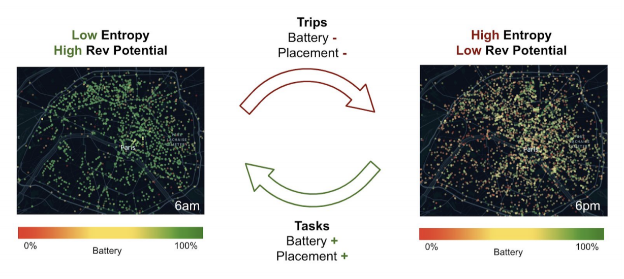 Lightweight dockless vehicles are deployed at full battery in the highest-demand locations. Throughout the day, trips bring them to a lower-trip-potential state. When and where should Lime pick up vehicles to complete charging and rebalancing tasks?