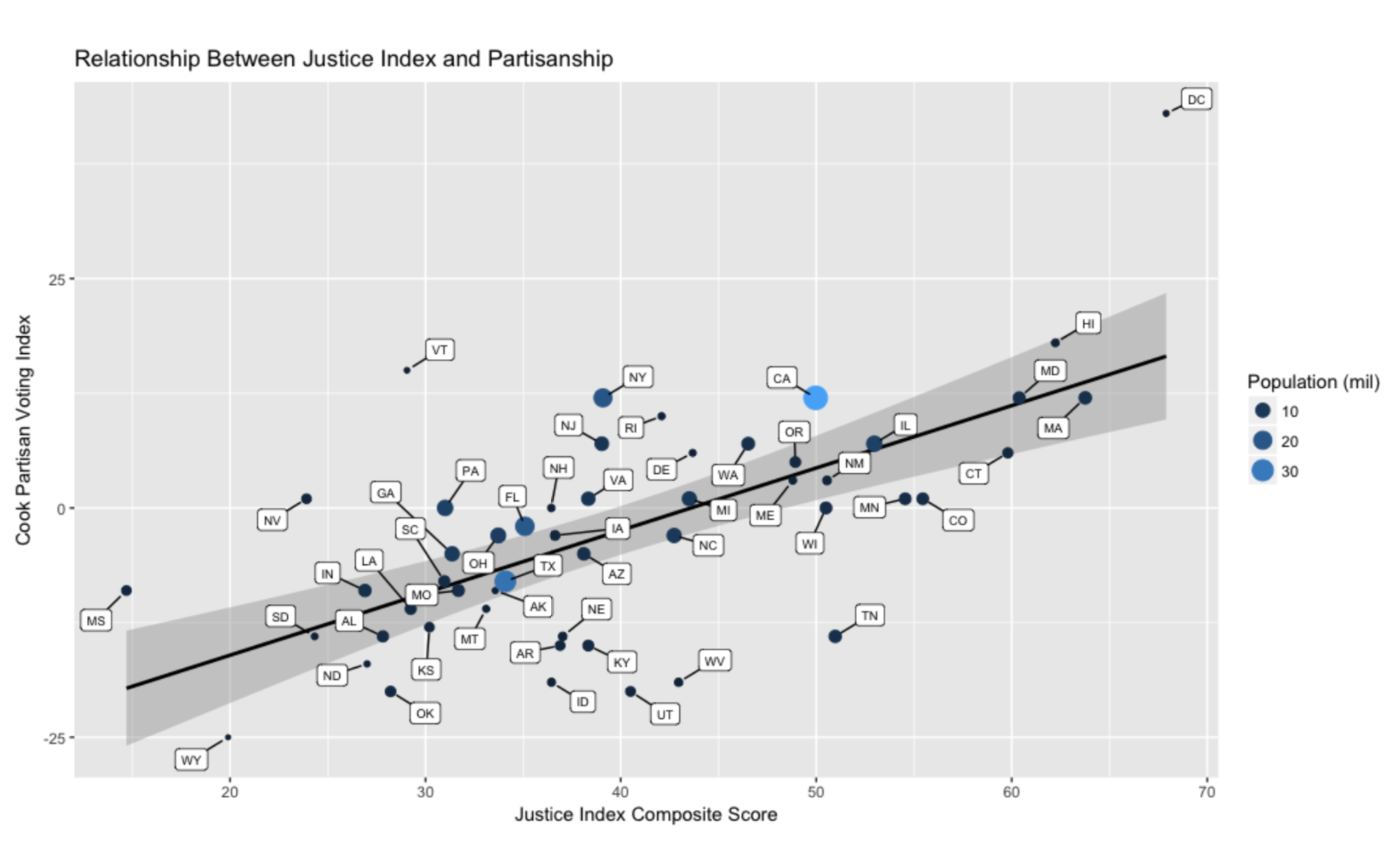 The National Center for Access to Justice (NCAJ) created the Justice Index, a quantifiable metric to track state civil legal initiatives and hold government accountable, a la Eviction Lab. Which states perform better than other states, and why? How do these metrics correlate with partisan state leanings, income level, and other census information?